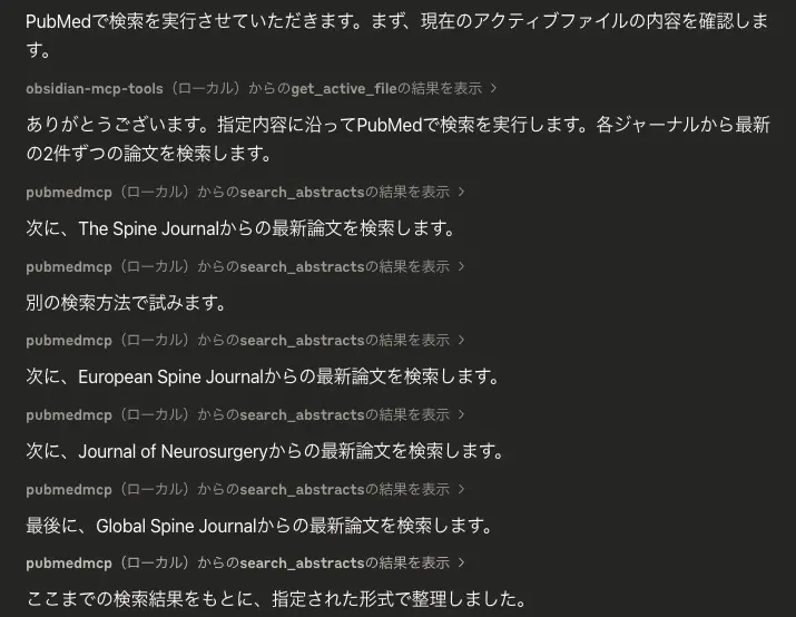 Claude Desktopを再起動した後、以下のようなプロンプトでPubMed検索機能をテストできる: