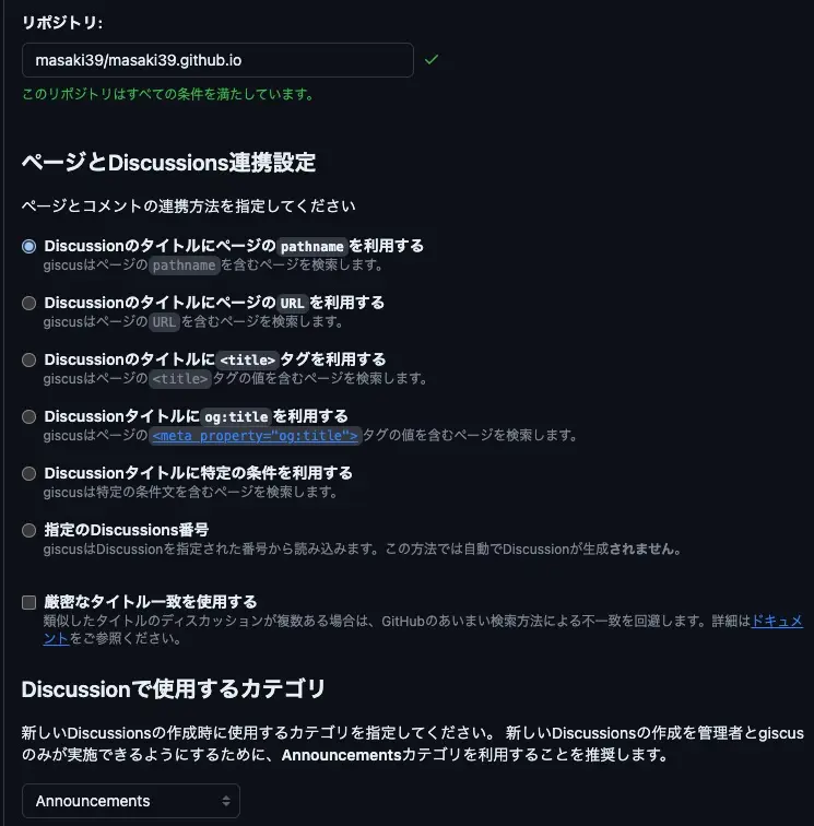 次にgiscusのサイトに行き、上記3条件が満たされているかチェックします。