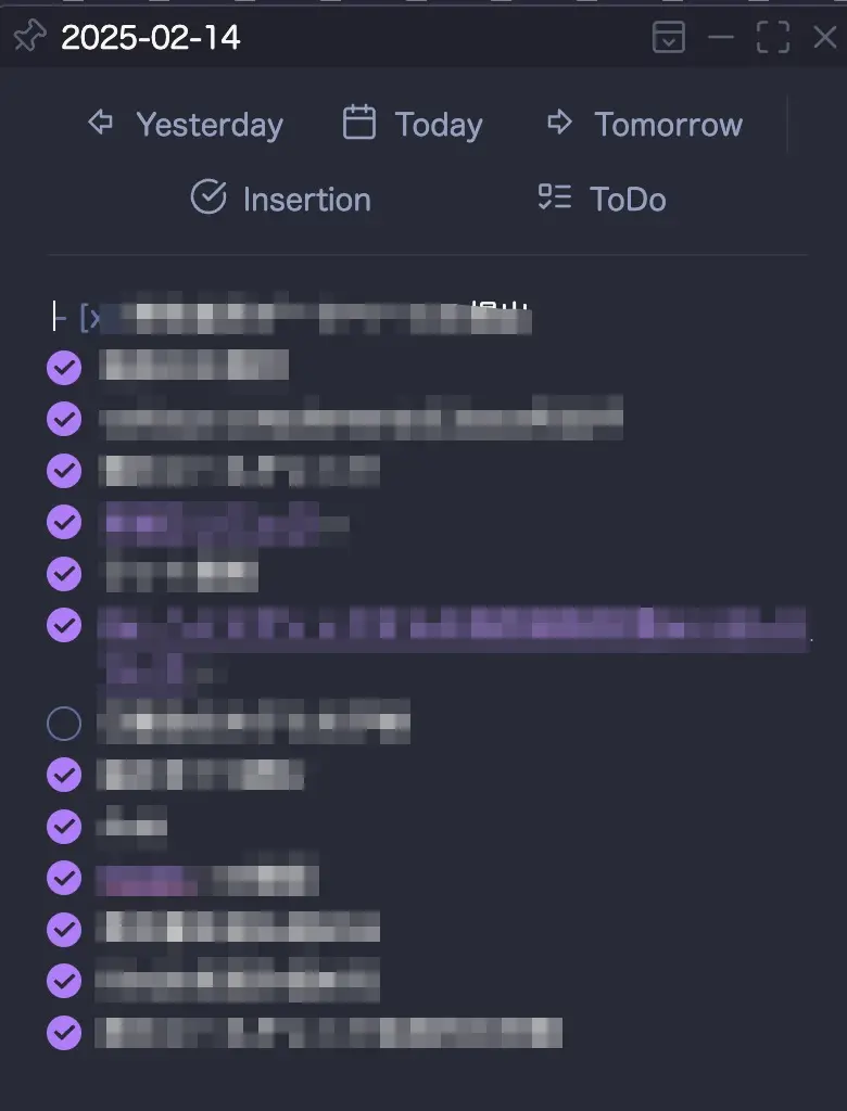 > > `$=dv.page(moment().format("YYYY-MM-DD"))? dv.taskList(dv.page(moment().format("YYYY-MM-DD")).file.tasks.where(t => t.completed), false): ""`※デイリーノートがDailyNotesフォルダに入っており、YYYY-MM-DDのフォーマットになっていることを想定しています。