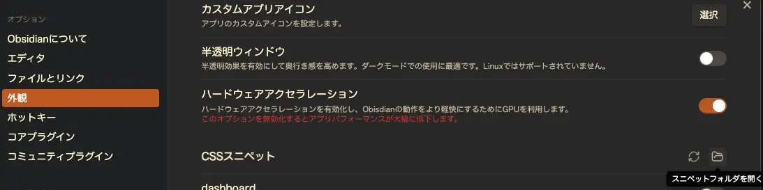 画像のObsidianの設定フォルダにCSSスニペットを追加する場所があります。スニペットフォルダに下記のCCSファイルを追加します。